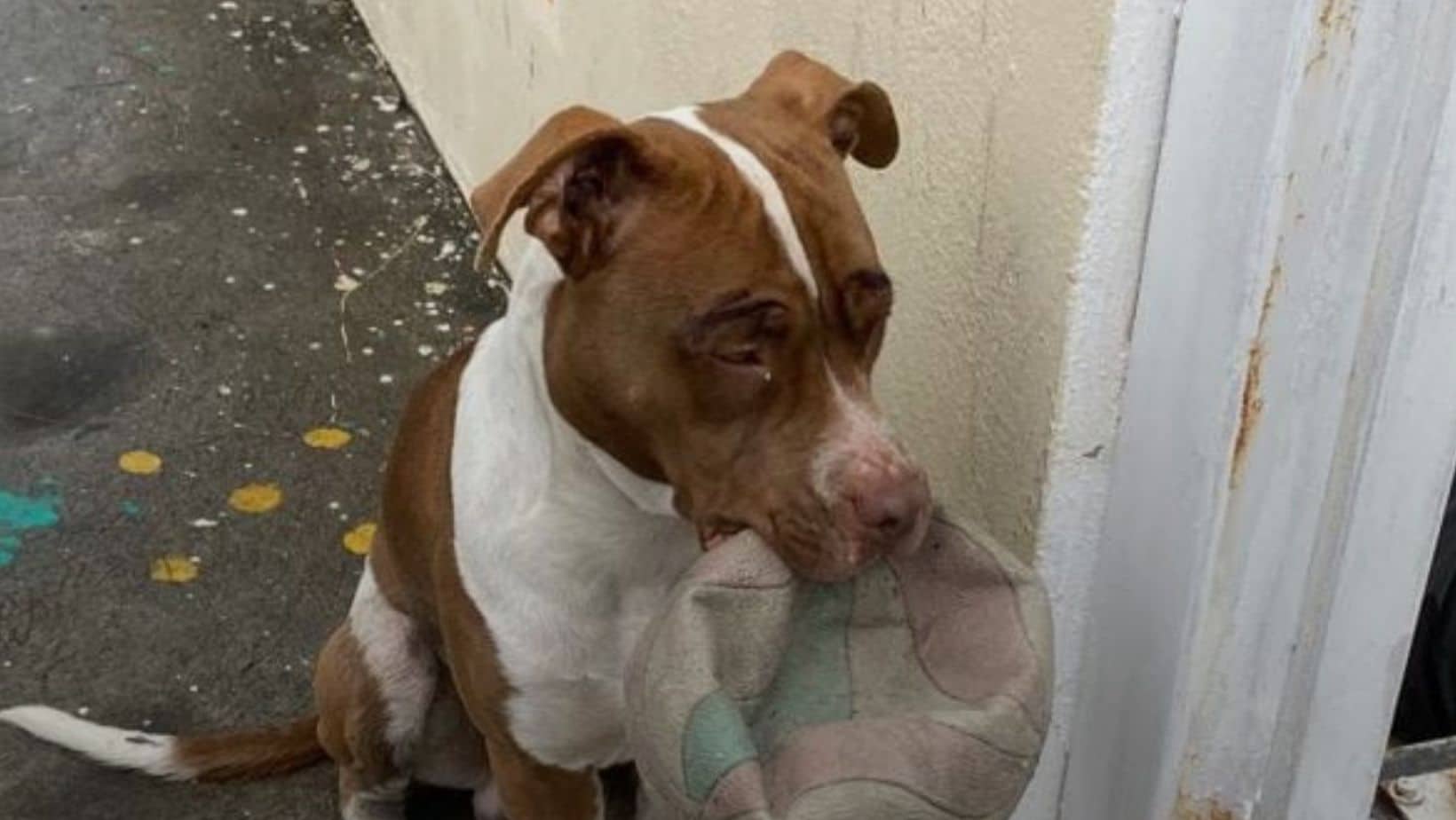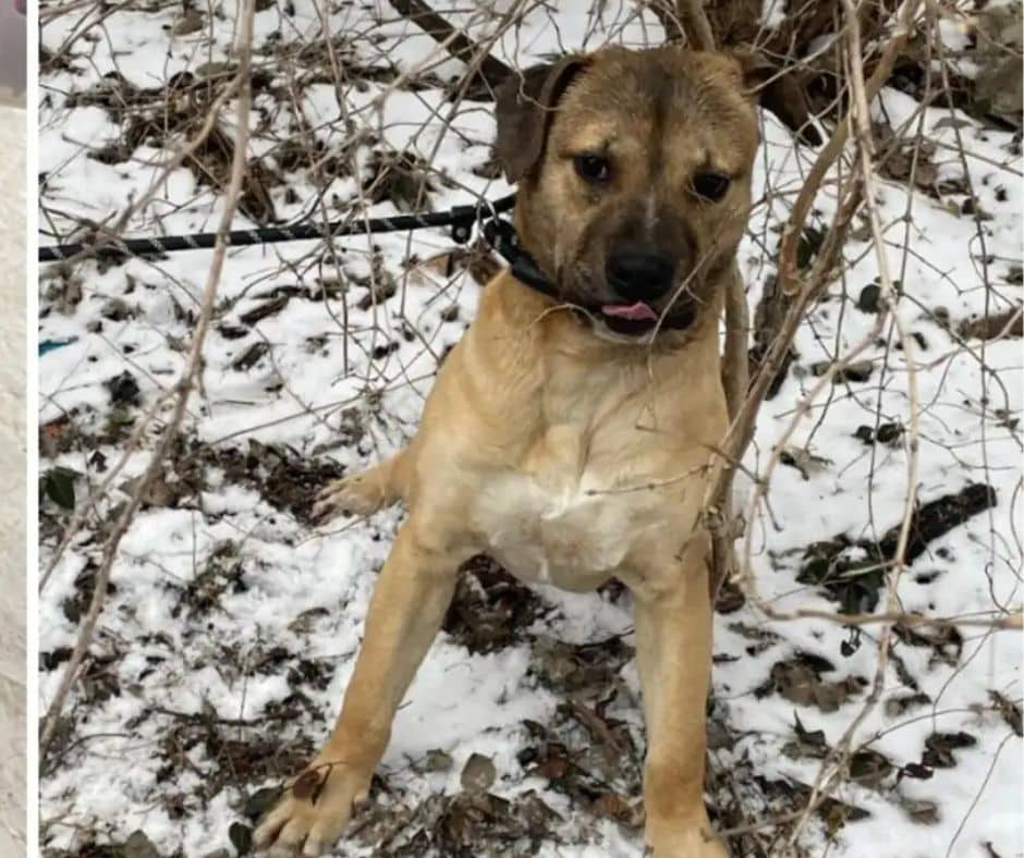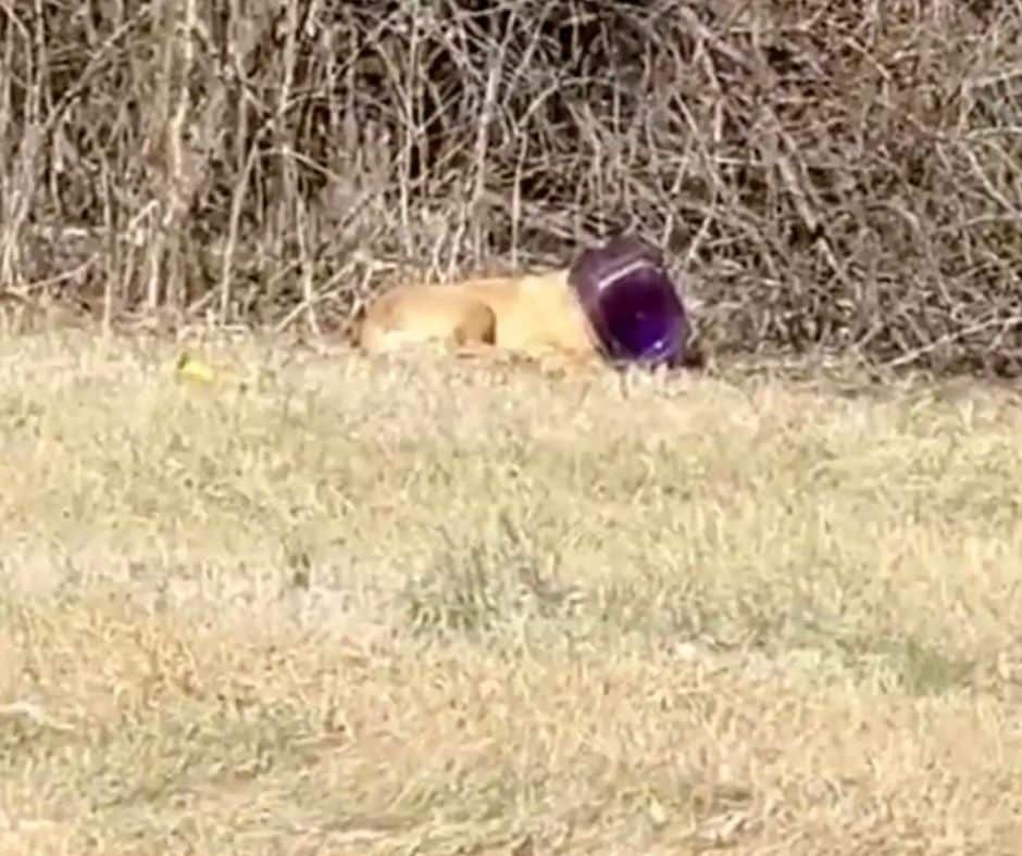A csapat már egy ideje követte a barna kutyát, de mindig elkerülte őket. Egy üres sajtos vödör azonban túl csábítónak bizonyult az éhes kutya számára, és most az egész feje benne rekedt.