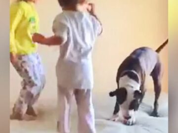 A pitbull észreveszi, hogy a gyerekek az ágyon ugrálnak, ezért úgy dönt, hogy ő is kipróbálja