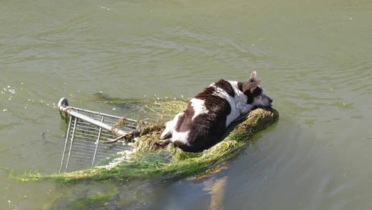 Egy idős kutya egy régi bevásárlókocsiba kapaszkodik, amely hamarosan elsüllyed